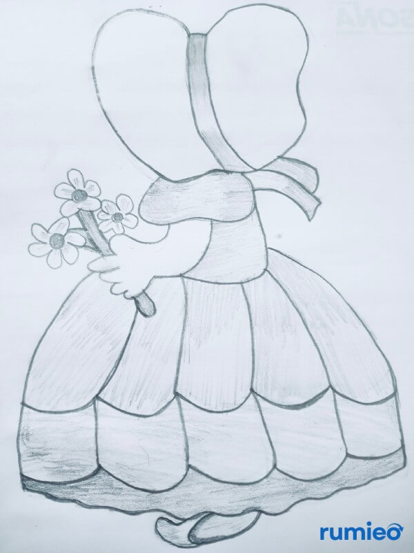 This is a drawing of a cute little girl aged 4-5 years. She is holding flowers in her hand and wearing a frock and hat. Kids will love to make this drawing.