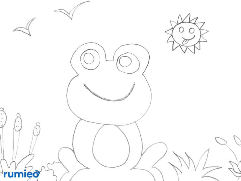 Imagine a happy frog sitting calmly on the bank of a pond with big round eyes. You want to draw this beautiful scene. We made it simple with the help of pencil, if you want you can color it with help of green color for frog. Coloring can make it looks lively and full of natural beauty.