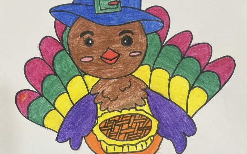 A vibrant and festive turkey drawing with multicolored feathers and a blue pilgrim hat. Ideal for Thanksgiving activities at home or school.