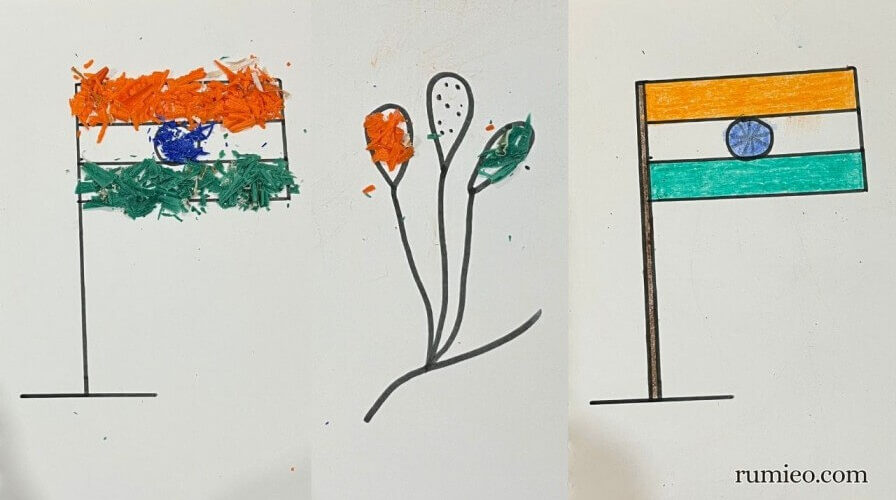- Just make kids to draw the Indian flag, and sharp the crayon, tell them sharped part should be placed on the flag.