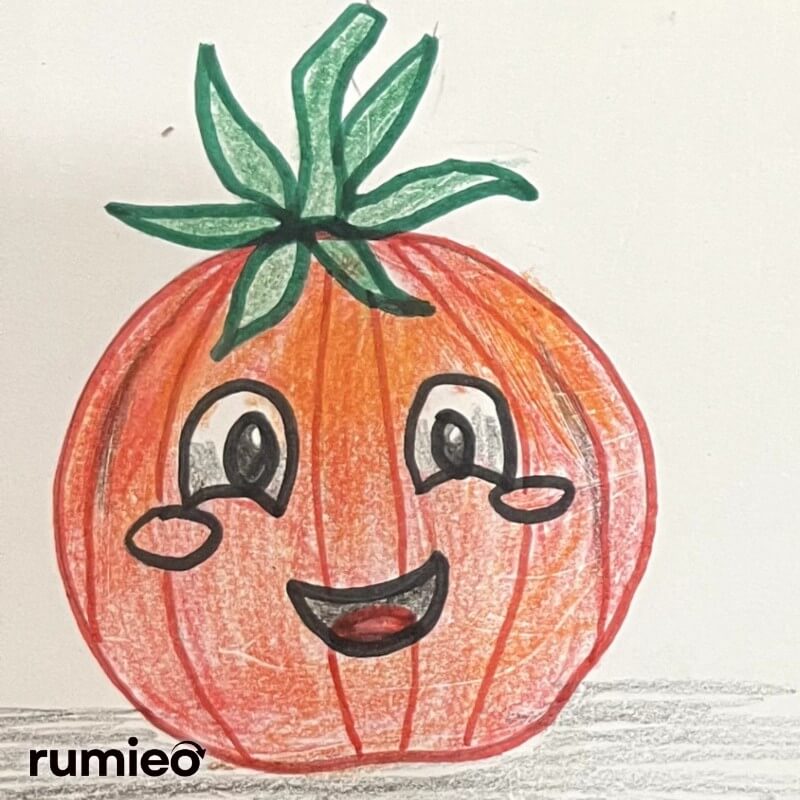 - Finally, draw big yes, cheeks and mouth to create a cartoon like look of tomato.